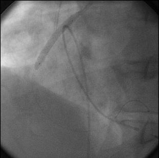 PTCA with stenting of mid RCA was done through right femoral approach with temporary pacemaker support. We faced great difficulty in engaging RCA due to anomalous high origin above left coronary sinus (Figure 5) resulting in kinking, coiling and distorted shaping of various guide catheters. We used 6Fr AR, AR2, AL2, JL3, XB3.5, JR, multipurpose Hockeystick II and RBV guide catheter but failed in getting adequate alignment (Figure 6,Figure 7). Finally, we succeeded using an AL1, 6Fr guide catheter. Mid RCA lesion was stented with AXXION (paclitaxel coated) 2.75mm x 18mm at 10 to 14atms pressure inflations (Figure 8). Post stent angiogram showed TIMI grade III flow without any complications (Figure 9, Figure 10).