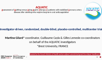 MADRID, Spain—Aspirin is harmful for patients with a chronic coronary syndrome, a high atherothrombotic risk, and an indication for oral anticoagulation (OAC) who are more than 6 months out from PCI, the French AQUATIC trial shows.
