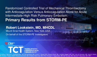 Lookstein R. Randomized controlled trial of mechanical thrombectomy with anticoagulation versus anticoagulation alone for acute intermediate-high risk pulmonary embolism: primary results from STORM-PE. Presented at: TCT 2025. October 26, 2025. San Francisco, CA.