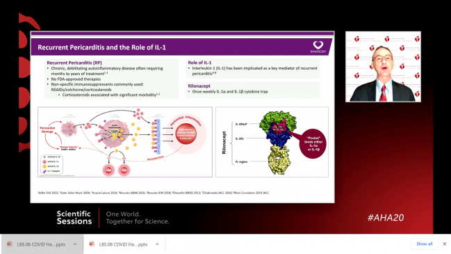 Speaking with TCTMD, Allan Klein, MD (Cleveland Clinic, OH), who presented the trial results Monday night at the virtual American Heart Association 2020 Scientific Sessions, estimated that there are an estimated 40,000 patients with pericarditis in the United States, many of them young women in midlife who develop it after a viral illness or surgery; up to 30% have a recurrent episode. “They go to the ER, some go on disability: it’s a big clinical burden and a big economic burden,” said Klein. “And the problem is, there are no FDA-approved therapies for this.”