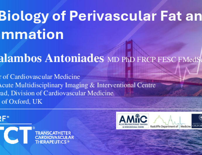 Presentation TCT 2025 The Biology of Perivascular Fat and Inflammation Presenter: Charalambos Antoniades October 26, 2025 REGISTER for free or LOG IN to view this content TCT 2025 Up Next Presentation TCT 2025 Inflammation: Why Does it Matter? Presenter: Roxana Mehran October 26, 2025 More slides + Presentation TCT 2025 The Thousand Faces: A Case Series of Cutting Edge IVL Technology in Multiple Forms of Coronary Calcification Presenter: Keith Andrew Chan October 26, 2025 Presentation TCT 2025 Calcified Anomalous Coronary Artery: A Challenging Scenario for Complex PCI Presenter: Christian Nolte October 26, 2025 We Recommend Disclosures <p>Nothing to disclose</p>