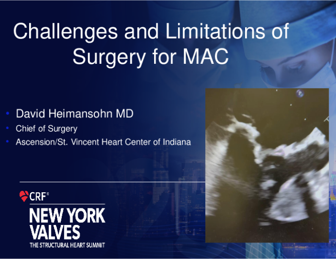 Presentation NY Valves 2025 Challenges and Limitations of… Surgery for MAC (Including Hybrid Strategies) Presenter: David Heimansohn June 26, 2025 REGISTER for free or LOG IN to view this content NY Valves 2025 Up Next Presentation NY Valves 2025 Challenges and Limitations of… Current Transcatheter Options for MAC Presenter: Pradeep K. Yadav June 26, 2025 More slides + Presentation NY Valves 2025 A Lifetime of Mitral Management Misteries: Therapy Failure Modes and Disease Progression Presenter: D. Scott Lim June 26, 2025 Presentation NY Valves 2025 Case Presentation Presenter: Steven F. Bolling June 26, 2025 We Recommend Disclosures Nothing to disclose Video Player is loading.Play VideoPlaySkip BackwardSkip ForwardMuteCurrent Time 0:00/Duration 7:25Loaded: 0%0:00Stream Type LIVESeek to live, currently behind liveLIVERemaining Time -7:25 1xPlayback Rate2x1.75x1.5x1.25x1x, selected0.75x0.5xChaptersChaptersDescriptionsdescriptions off, selectedCaptionscaptions settings, opens captions settings dialogcaptions off, selectedAudio Tracken (Main), selectedPicture-in-PictureFullscreenThis is a modal window.Beginning of dialog window. Escape will cancel and close the window.TextColorWhiteBlackRedGreenBlueYellowMagentaCyanOpacityOpaqueSemi-TransparentText BackgroundColorBlackWhiteRedGreenBlueYellowMagentaCyanOpacityOpaqueSemi-TransparentTransparentCaption Area BackgroundColorBlackWhiteRedGreenBlueYellowMagentaCyanOpacityTransparentSemi-TransparentOpaqueFont Size50%75%100%125%150%175%200%300%400%Text Edge StyleNoneRaisedDepressedUniformDrop shadowFont FamilyProportional Sans-SerifMonospace Sans-SerifProportional SerifMonospace SerifCasualScriptSmall CapsResetDoneClose Modal DialogEnd of dialog window.Close Modal DialogThis is a modal window. This modal can be closed by pressing the Escape key or activating the close button.