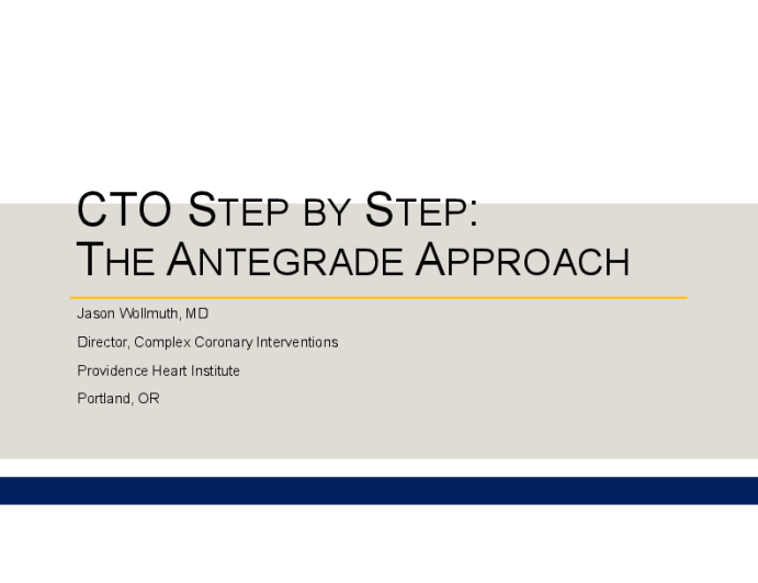 Presentation Cardiovascular Interventions 2022 CTO STEP BY STEP: THE ANTEGRADE APPROACH Presenter: Jason Wollmuth October 28, 2022 REGISTER for free or LOG IN to view this content Coronary CTO Presentation Cardiovascular Interventions 2022 Up Next Presentation Cardiovascular Interventions 2022 What’s new in CTO PCI Presenter: Bill Lombardi October 28, 2022 More slides + Presentation Cardiovascular Interventions 2022 OCT GUIDED DES DAPT & LIPID MANGEMENT Presenter: Richard Shlofmitz October 28, 2022 Presentation CTO 2023 Changes in Renal Function After Chronic Total Occlusion Interventions Presenter: Pablo Antunez Muiños February 23, 2023 We Recommend