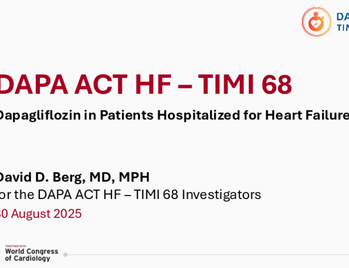 Presentation ESC 2025 DAPA ACT HF – TIMI 68: Dapagliflozin in Patients Hospitalized for Heart Failure Presenter: David D. Berg August 30, 2025 REGISTER for free or LOG IN to view this content Heart Failure Heart Failure Pharma Presentation ESC 2025 Up Next Presentation ESC 2025 SWEDEPAD 1 and 2: Impact of drug-coated devices in patients with peripheral arterial disease Presenter: Mårten Falkenberg August 31, 2025 More slides + Presentation ESC 2025 Tailored Antiplatelet Therapy in High-Risk Patients Undergoing Complex PCI: The TAILORED-CHIP Randomized Clinical Trial Presenter: Duk-Woo Park August 31, 2025 Presentation ESC 2025 Randomized trial of evolocumab on saphenous vein graft patency following coronary artery bypass surgery: The NEWTON-CABG CardioLink-5 Trial Presenter: Subodh Verma September 01, 2025 We Recommend