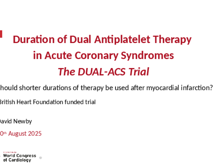 Presentation ESC 2025 Duration of Dual Antiplatelet Therapy in Acute Coronary Syndromes: The DUAL-ACS Trial Presenter: David Newby September 03, 2025 REGISTER for free or LOG IN to view this content Coronary ACS/AMI Presentation ESC 2025 Up Next Presentation ESC 2025 Dual or single antiplatelet therapy after coronary artery bypass grafting in patients with acute coronary syndrome: The TACSI trial Presenter: Anders Jeppsson September 01, 2025 More slides + Presentation ESC 2025 BETAMI-DANBLOCK: Randomized Discontinuation of Beta-blockers After Myocardial Infarction in Patients Without Heart Failure Presenter: Eva Prescott August 30, 2025 Presentation ESC 2025 Helicobacter Pylori Screening after Acute Myocardial Infarction: The Cluster Randomized Crossover HELP-MI-SWEDEHEART Trial Presenter: Robin Hofmann August 31, 2025 We Recommend