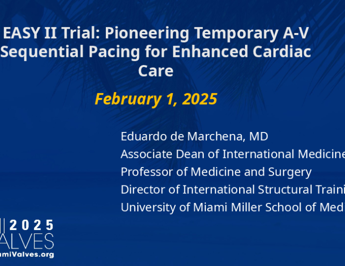 Presentation Miami Valves 2025 EASY II Trial: Pioneering Temporary A-V Sequential Pacing for Enhanced Cardiac Care Presenter: Eduardo de Marchena January 30, 2025 REGISTER for free or LOG IN to view this content Heart Rhythm Pacing/ICDs Presentation Miami Valves 2025 Up Next Presentation Miami Valves 2025 Novel Device for Pulmonic Valve: Alterra Presenter: Pedro Villablanca January 30, 2025 More slides + Presentation Miami Valves 2025 A Past Medical History of PE or DVT Impacts In-Hospital Outcomes of Patients Undergoing Elective Isolated Percutaneous Aortic Valve Replacement Presenter: Lourdes Villarrubia Varela January 30, 2025 Presentation Miami Valves 2025 Valve-in-Ring TMVR with CLEVE (Clearance of the Leaflet to Eliminate Valve Excursion) Presenter: Laura Muller January 30, 2025 We Recommend