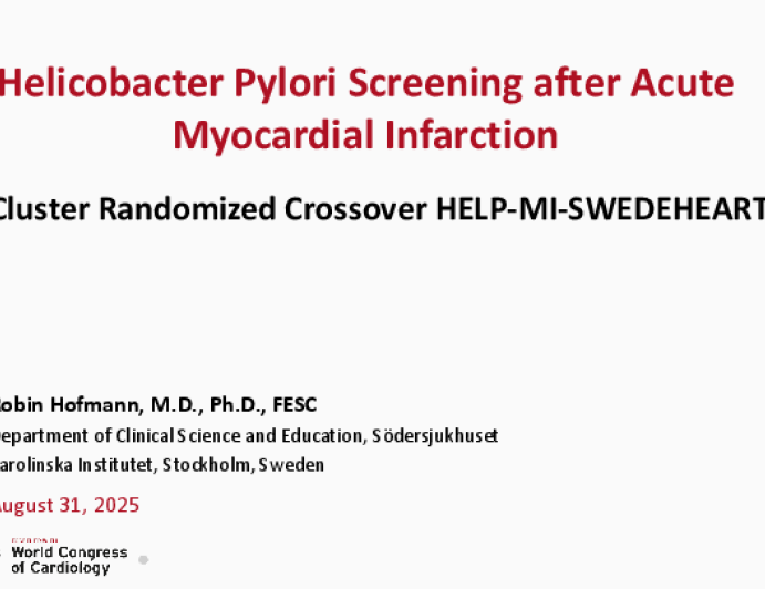 Presentation ESC 2025 Helicobacter Pylori Screening after Acute Myocardial Infarction: The Cluster Randomized Crossover HELP-MI-SWEDEHEART Trial Presenter: Robin Hofmann August 31, 2025 REGISTER for free or LOG IN to view this content Clinical Cardiology Clinical Pharma Coronary CAD Pharma ACS/AMI Presentation ESC 2025 Up Next Presentation ESC 2025 DAPA ACT HF – TIMI 68: Dapagliflozin in Patients Hospitalized for Heart Failure Presenter: David D. Berg August 30, 2025 More slides + Presentation ESC 2025 SWEDEPAD 1 and 2: Impact of drug-coated devices in patients with peripheral arterial disease Presenter: Mårten Falkenberg August 31, 2025 Presentation ESC 2025 Tailored Antiplatelet Therapy in High-Risk Patients Undergoing Complex PCI: The TAILORED-CHIP Randomized Clinical Trial Presenter: Duk-Woo Park August 31, 2025 We Recommend
