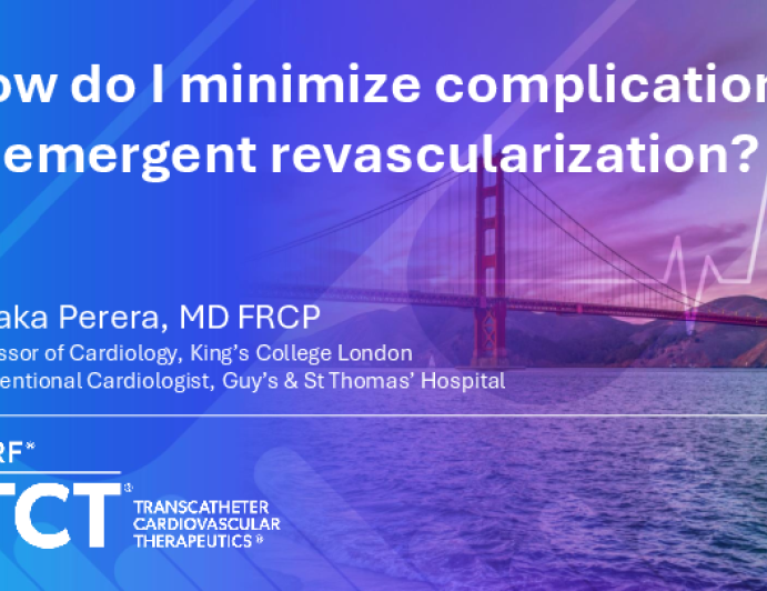 Presentation TCT 2025 How Do I Minimize Complications of Emergent Revascularization? Presenter: Divaka Perera October 28, 2025 REGISTER for free or LOG IN to view this content TCT 2025 Up Next Presentation TCT 2025 TCT 1563: Ellis Type III Coronary Perforation in the Left Main Coronary Artery (LMCA), Repaired With a Covered Stent From LMCA to LAD, Using Reverse DK-Crush Culotte Technique for LMCA-LAD-CX Presenter: Jazmin Hernández Suástegui October 28, 2025 More slides + Presentation TCT 2025 TCT 1562: Proximal LAD Perforation During High-Risk LM-LAD PCI: Managing Covered Stents Without Compromising Main Branch Bifurcation Presenter: Mo'ath Bani Ali October 28, 2025 Presentation TCT 2025 TCT 1561: No Time to Bleed: Rapid Rescue of RCA Perforation in a Post-CABG PCI Presenter: Saro Avedikian October 28, 2025 We Recommend Disclosures <p>Nothing to disclose</p>
