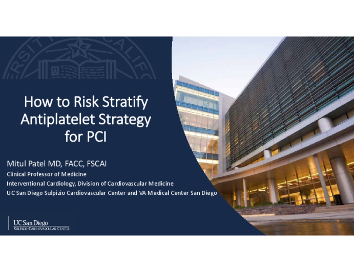 Presentation Cardiovascular Interventions 2022 How to Risk Stratify Antiplatelet Strategy for PCI Presenter: Mitul Patel October 28, 2022 REGISTER for free or LOG IN to view this content Coronary Presentation Cardiovascular Interventions 2022 PCI Up Next Presentation Cardiovascular Interventions 2022 Electrosurgery in the Cath Lab: BASILICA, LAMPOON, SESAME & SEATTLE Presenter: Jamie McCabe October 28, 2022 More slides + Presentation Cardiovascular Interventions 2022 We Should Be Offering More PCI to Patients With Complex Multivessel Disease Presenter: Paul S. Teirstein October 28, 2022 Presentation Cardiovascular Interventions 2022 TAVR 2022 Overview: What’s new? Presenter: Paul S. Teirstein October 28, 2022 We Recommend