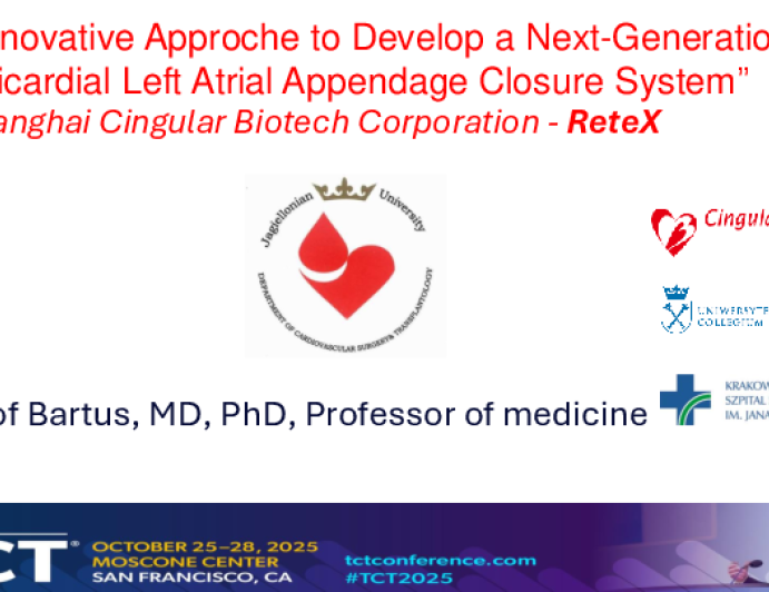 Presentation TCT 2025 Innovative Approach to Develop a Next-Generation Epicardial LAA Closure (ReteX) Presenter: Krzysztof Bartus October 26, 2025 REGISTER for free or LOG IN to view this content TCT 2025 Up Next Presentation TCT 2025 YoungHeartValve Presenter: Lakshmi Prasad Dasi October 26, 2025 More slides + Presentation TCT 2025 A Prospective Multicenter Trial of On-The-Table Pharmaco-Mechanical Lysis for Acute Intermediate-Risk (Thrombolex) Pulmonary Embolism: Interim Analysis of the RAPID-PE Study Presenter: Wissam A. Jaber October 26, 2025 Presentation TCT 2025 Flow Restoration to the LAA: Rethinking LAAC Strategy (ReLAAx) Presenter: Rob Taft October 26, 2025 We Recommend Disclosures <p>Nothing to disclose</p>