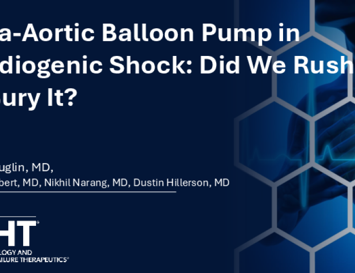 Presentation THT 2026 Intraaortic Balloon Pump in Cardiogenic Shock: Did We Rush to Bury It? Presenter: Maya Guglin March 02, 2026 REGISTER for free or LOG IN to view this content THT 2026 Up Next Presentation THT 2026 SHOCK-PRECISION: Early Phenotype-Guided Mechanical Circulatory Support in Cardiogenic Shock Presenter: Juliana Giorgi March 02, 2026 More slides + Presentation THT 2026 PARACHUTE-PCI: An adaptive, sham-controlled, simultaneous crossover trial of microaxial flow pumps to prevent cardiogenic shock during high risk PCI Presenter: Pankaj Jain March 02, 2026 Presentation THT 2026 Development and Validation of a Model to Predict Risk of Dialysis Following Ventricular Assist Device Placement Presenter: Wendy McCallum March 02, 2026 We Recommend Disclosures <p>Nothing to disclose</p>