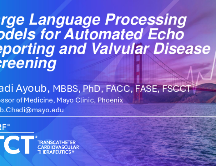 Presentation TCT 2025 Large Language Processing Models for Automated Echo Reporting and Valvular Disease Screening Presenter: Chadi Ayoub October 26, 2025 REGISTER for free or LOG IN to view this content TCT 2025 Up Next Presentation TCT 2025 From ECG Cart to Wearables: The New Wave of Cardiac Disease Screening? Presenter: Mintu P. Turakhia October 26, 2025 More slides + Presentation TCT 2025 Keynote Lecture: AI-Powered Screening of Heart Disease: Future Trends and Opportunities Presenter: Geoffrey Tison October 26, 2025 Presentation TCT 2025 AI-Powered Imaging for SHD Care: Current Tools and Future Perspectives Presenter: Partho P. Sengupta October 26, 2025 We Recommend Disclosures <p>Nothing to disclose</p>