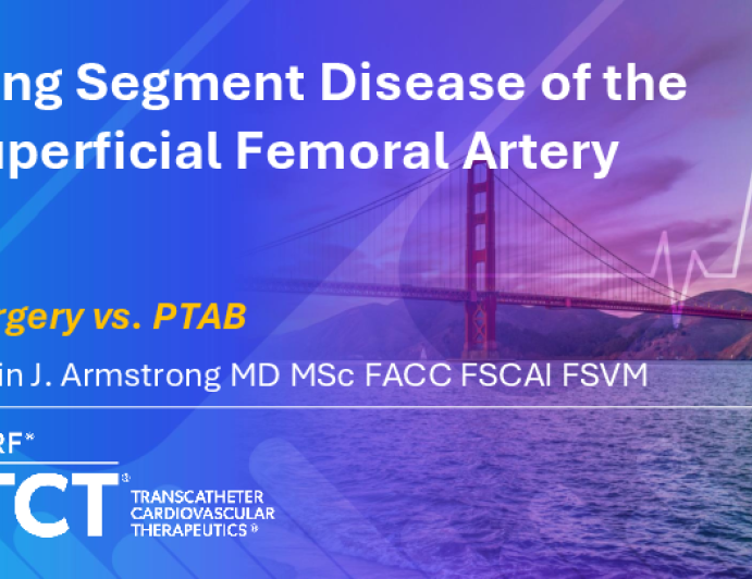 Presentation TCT 2025 Long Segment SFA Disease – Surgery vs. PTAB Presenter: Ehrin J. Armstrong October 26, 2025 REGISTER for free or LOG IN to view this content TCT 2025 Up Next Presentation TCT 2025 Prepping the SFA with IVL vs. Atherectomy – 2025 State of the Art Presenter: Brian G. DeRubertis October 26, 2025 More slides + Presentation TCT 2025 Does the SIRONA Trial Answer Our Questions about Sirolimus in the SFA? Presenter: Dierk Scheinert October 26, 2025 Presentation TCT 2025 Avoiding Complications and How to Deal with Them if They Arise Presenter: Robert A. Lookstein October 26, 2025 We Recommend Disclosures <p>Nothing to disclose</p>