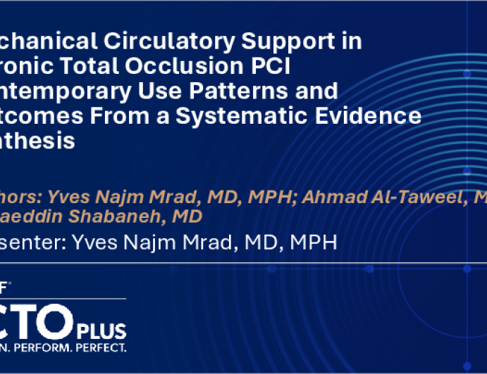 Presentation CTO 2026 Mechanical Circulatory Support in Chronic Total Occlusion PCI: A Systematic Review and Meta-Analysis Presenter: Yves Najm Mrad February 13, 2026 REGISTER for free or LOG IN to view this content CTO 2026 Up Next Presentation CTO 2026 Sex-Based Differences in Periprocedural Complications and 1-Year Outcomes After CTO PCI: Evidence From Contemporary Registries Presenter: Yves Najm Mrad February 13, 2026 More slides + Presentation CTO 2026 Clinical Outcomes of Re-Attempted CTO PCI After Prior Failure: A Systematic Review Anchored by a Contemporary Cohort Presenter: Yves Najm Mrad February 13, 2026 Presentation CTO 2026 The Impact of Preprocedural Coronary Computed Tomography Angiography in Chronic Total Occlusions: From PROGRESS-CTO Registry Presenter: Pedro Carvalho February 13, 2026 We Recommend Disclosures <p>Nothing to disclose</p>