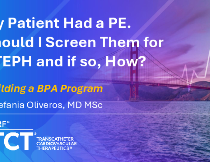 Presentation TCT 2025 My Patient Has Had a PE. Should I Screen Them for CTEPH and if so, How? Presenter: Estefania Oliveros October 27, 2025 REGISTER for free or LOG IN to view this content TCT 2025 Up Next Presentation TCT 2025 I Suspect CTEPH: How to Interpret RHC Findings and How to Get the Best Pulmonary Angiogram Possible Presenter: Vladimir Lakhter October 27, 2025 More slides + Presentation TCT 2025 Who Gets Drugs, Intervention, and/or Surgery? The Role of a CTEPH Team Presenter: John Gerry Coghlan October 27, 2025 Presentation TCT 2025 How to Start a BPA program - What are the Nuts and Bolts of the Procedure? Presenter: Vikas Aggarwal October 27, 2025 We Recommend Disclosures <p>Nothing to disclose</p>