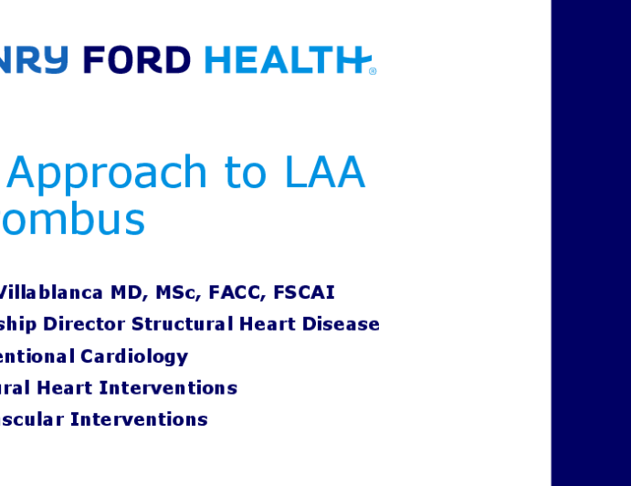Presentation TCT 2025 My Personal Guide to Left Atrial Thrombosis Presenter: Pedro Arturo Villablanca October 25, 2025 REGISTER for free or LOG IN to view this content TCT 2025 Up Next Presentation TCT 2025 TCT 1367: From Clot to Clear: AngioVac Extraction of Massive Left Atrial Appendage Thrombus Presenter: Rishi Sukhija October 25, 2025 More slides + Presentation TCT 2025 TCT 1510: Simultaneous Transcatheter Aortic and Mitral Valve Replacement (STVR): TAVR + BATMAN-Facilitated Valve-in-MAC for a High-Risk Neo-LVOT Presenter: Oscar Millan-Iturbe October 25, 2025 Presentation TCT 2025 TCT 1509: Three at Once: Challenging Simultaneous Aortic Valve-in-Valve With Chimney Stenting and Transcatheter Mitral Valve-in-Valve Presenter: Hector Alfonso Alvarez Covarrubias October 25, 2025 We Recommend Disclosures <p>Nothing to disclose</p>