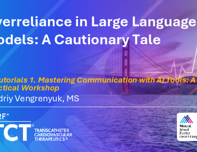 Presentation TCT 2025 Overreliance in Large Language Models: A Cautionary Tale Presenter: Andriy Vengrenyuk October 26, 2025 REGISTER for free or LOG IN to view this content TCT 2025 Up Next Presentation TCT 2025 Prompt Tutorial: Hands-On Workshop Presenter: Ovidiu Dressler October 26, 2025 More slides + Presentation TCT 2025 12-Lead AI ECG Algorithm to Predict Coronary Flow Reserve and Capacity as Verified by PET-CT (Heartio) Presenter: Michael Leasure October 26, 2025 Presentation TCT 2025 Noise to Knowledge: Accelerating Detection of Valvular Heart Disease with Stethophone AI-Phonoscopy. Presenter: Mark Attila Opauszky October 26, 2025 We Recommend Disclosures <p>Nothing to disclose</p>