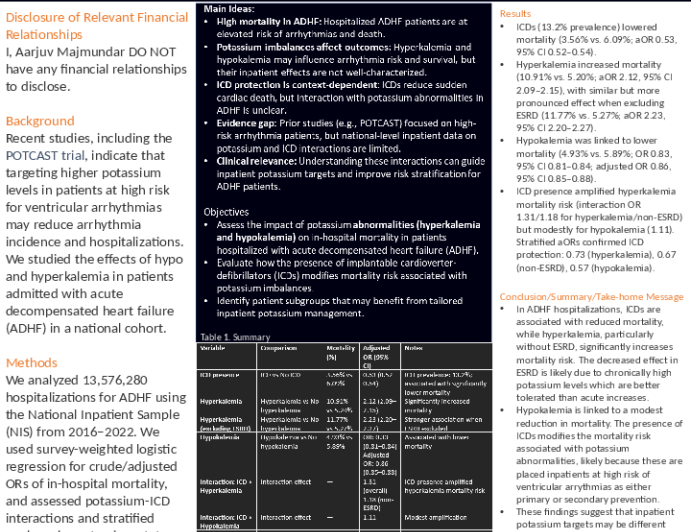 Presentation THT Abstracts 2026 Potassium Levels and In-Hospital Mortality in Acute Heart Failure Presenter: Aarjuv Majmundar March 03, 2026 REGISTER for free or LOG IN to view this content Heart Failure Presentation THT Abstracts 2026 Up Next Presentation THT Abstracts 2026 Tailoring MCS in Cardiogenic Shock Presenter: Brett Cohen March 03, 2026 More slides + Presentation THT Abstracts 2026 Impact of Pulmonary Hypertension Subtypes on Clinical Outcomes and Resource Utilization in Heart Failure Presenter: Bryce Allen March 03, 2026 Presentation THT Abstracts 2026 The Impact of Aortic Stenosis on the Obesity Paradox in Acute Decompensated Heart Failure Presenter: Bryce Allen March 03, 2026 We Recommend