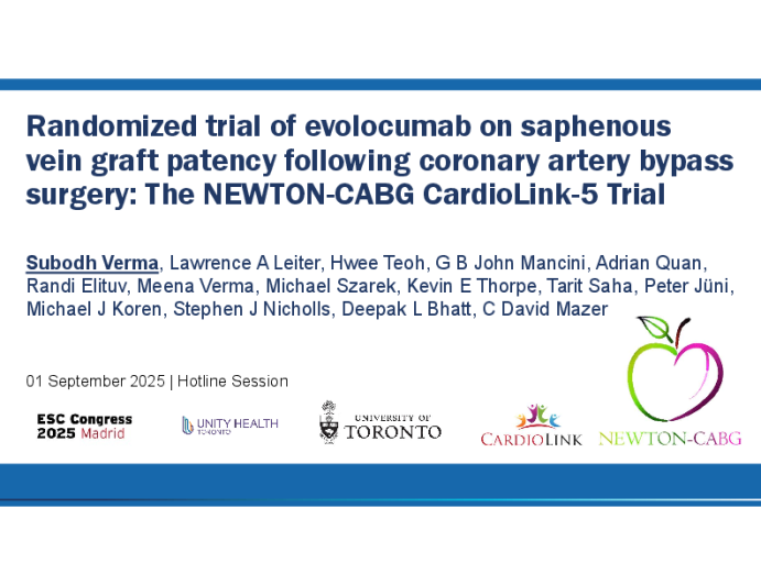 Presentation ESC 2025 Randomized trial of evolocumab on saphenous vein graft patency following coronary artery bypass surgery: The NEWTON-CABG CardioLink-5 Trial Presenter: Subodh Verma September 01, 2025 REGISTER for free or LOG IN to view this content Coronary Cardiac Surgery Presentation ESC 2025 Up Next Presentation ESC 2025 ABC-AF study: Pragmatic registry-based randomised controlled trial of personalised treatment to reduce stroke or death in atrial fibrillation Presenter: Jonas Oldgren August 30, 2025 More slides + Presentation ESC 2025 Vericiguat in ambulatory patients with chronic heart failure with reduced ejection fraction: Results of the VICTOR trial Presenter: Faiez Zannad August 30, 2025 Presentation TCT India 2025 Understanding the etiology and imaging diagnosis of stent failure – acute vs late, morphology, and more Presenter: Ramesh Daggubati July 25, 2025 We Recommend