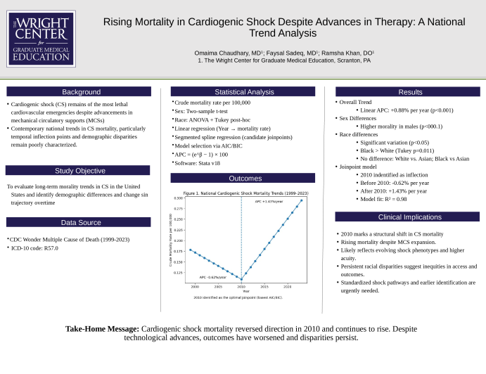 Presentation THT Abstracts 2026 Rising Mortality in Cardiogenic Shock Despite Advances in Therapy: A National Trend Analysis Presenter: Omaima Chaudhary March 02, 2026 REGISTER for free or LOG IN to view this content Heart Failure Presentation THT Abstracts 2026 Up Next Presentation THT Abstracts 2026 Rising Mortality from Concurrent Heart Failure and Ventricular Tachycardia: A 25-Year Trend Analysis Presenter: Hriday Shah March 02, 2026 More slides + Presentation THT Abstracts 2026 Early Impella Versus Intra-Aortic Balloon Pump in Cardiogenic Shock: A National Inpatient Sample Analysis Presenter: Omaima Chaudhary March 02, 2026 Presentation THT Abstracts 2026 Echocardiographic Assessment of Progressive Dyspnea in an LVAD Patient Presenter: Kevin O’Gorman March 02, 2026 We Recommend