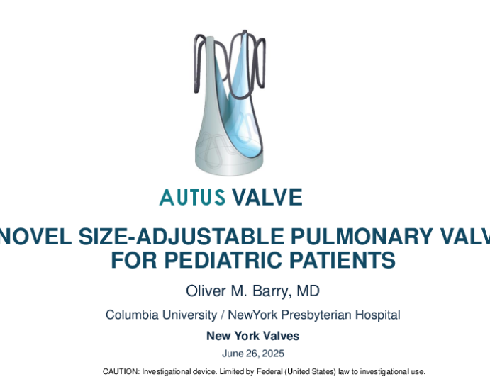 Presentation NY Valves 2025 Synthetic Size-Adjustable Surgical Pulmonary Valve Replacement for Pediatric Patients: Autus Valve Technologies Presenter: Oliver Barry June 26, 2025 REGISTER for free or LOG IN to view this content NY Valves 2025 Up Next Presentation NY Valves 2025 The CroiValve DUO Novel Tricuspid Coaptation Valve System Presenter: Wojtek Wojakowski June 26, 2025 More slides + Presentation NY Valves 2025 Laplace TTVR System: EFS Update Presenter: Brandon M. Jones June 26, 2025 Presentation NY Valves 2025 Trisol TTVR System: EFS Update Presenter: Vinod H. Thourani June 26, 2025 We Recommend Disclosures Nothing to disclose