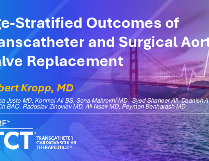 Presentation TCT 2025 TCT 1104: Age-Stratified Outcomes of Transcatheter versus Surgical Aortic Valve Replacement Presenter: Robert G. Kropp October 25, 2025 REGISTER for free or LOG IN to view this content TCT 2025 Up Next Presentation TCT 2025 TCT 1105: Transcatheter Versus Surgical Management of Combined Aortic Stenosis and Coronary Artery Disease in Older Adults with Chronic Kidney Disease Presenter: Dawood Shehzad October 25, 2025 More slides + Presentation TCT 2025 TCT 1100: Transcatheter Versus Surgical Aortic Valve Replacement in Patients Aged 50 to 65 Years: A Propensity Score-Matched Retrospective Study Presenter: Mohamed Doma October 25, 2025 Presentation TCT 2025 TCT 1097: Five-Year Mortality After Surgical vs. Transcatheter Valve Replacement in Low-Flow, Low-Gradient Aortic Stenosis Presenter: Xander Jacquemyn October 25, 2025 We Recommend Disclosures <p>Nothing to disclose</p>