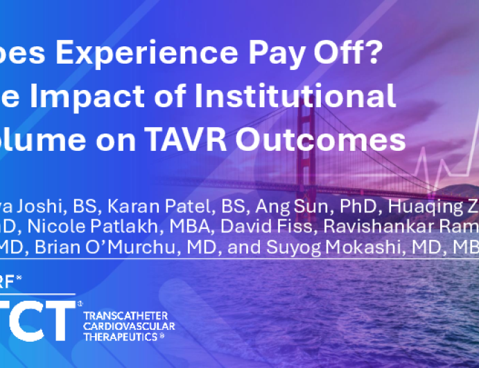 Presentation TCT 2025 TCT 1155: Does Experience Pay Off? The Impact of Institutional Volume on TAVR Outcomes Presenter: Priya Joshi October 27, 2025 REGISTER for free or LOG IN to view this content TCT 2025 Up Next Presentation TCT 2025 TCT 1151: Impact of Perivascular Adipose Tissue Attenuation Around the Aortic Valve on Clinical Outcomes After Transcatheter Aortic Valve Replacement Presenter: Hiroya Okamoto October 27, 2025 More slides + Presentation TCT 2025 TCT 1154: The Relationship Between Race and Post-TAVR Bleeding Outcomes: Analysis from the Trans-Pacific TAVR (TP-TAVR) Registry Presenter: Meghana Iyer October 27, 2025 Presentation TCT 2025 TCT 1157: Prognostic value of algorithmically-derived invasive hemodynamic indices of paravalvular regurgitation after TAVR with Self-Expanding Devices for heart failure rehospitalization and all-cause mortality – the APPOSE registry Presenter: Geert Versteeg October 27, 2025 We Recommend Disclosures <p>Nothing to disclose</p>