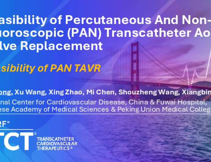 Presentation TCT 2025 TCT 1165: Feasibility of Percutanous And Non-Fluoroscopic (PAN) Transcatheter Aortic Valve Replacement Presenter: Jie Dong October 28, 2025 REGISTER for free or LOG IN to view this content TCT 2025 Up Next Presentation TCT 2025 TCT 124: Enhanced Prediction of Pacemaker Implantation Post-TAVI Using Pre-Procedural CTA, ECG, Device Characteristics, and Fluoroscopic Implant Depth Presenter: Karan Rao October 28, 2025 More slides + Presentation TCT 2025 TCT 50: Regional and Temporal Trends in Mortality Among Older Adults With Atrial Fibrillation and Cardiac or Vascular Device Complications in the U.S. (1999–2023), With ARIMA Forecasting Presenter: Muhammad Zahid October 28, 2025 Presentation TCT 2025 TCT 49: Bone Morphogenetic Protein 10 (BMP-10) as a Biomarker of Post-Ablation Atrial Fibrillation Presenter: Kuseme Udoh October 28, 2025 We Recommend Disclosures <p>Nothing to disclose</p>