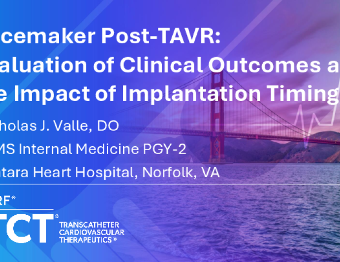Presentation TCT 2025 TCT 121: Pacemaker Post-TAVR: Evaluation of Clinical Outcomes and the Impact of Implantation Timing Presenter: Nicholas Joseph Valle October 28, 2025 REGISTER for free or LOG IN to view this content TCT 2025 Up Next Presentation TCT 2025 TCT 238: Initial Experience with New Version of Magnesium Bioabsorbable Scaffold FREESOLVETM: Clinical and Angiographic-based Murray’s QFR and Radial Walls Strain Evaluation Presenter: Stefano Galli October 28, 2025 More slides + Presentation TCT 2025 TCT 239: OCT-Based Plaque Burden Estimation, Vulnerable Plaque Prevalence, and Scaffold Performance in Patients Treated With a Bioresorbable Magnesium Scaffold: A Sub analysis of the BIOMAG-I Study Presenter: Pablo M. Rubio October 28, 2025 Presentation TCT 2025 TCT 1168: Oversizing in TAVR Valve Selection: Are We Getting the Size Right? Presenter: Abbad Sultan October 28, 2025 We Recommend Disclosures <p>Nothing to disclose</p>