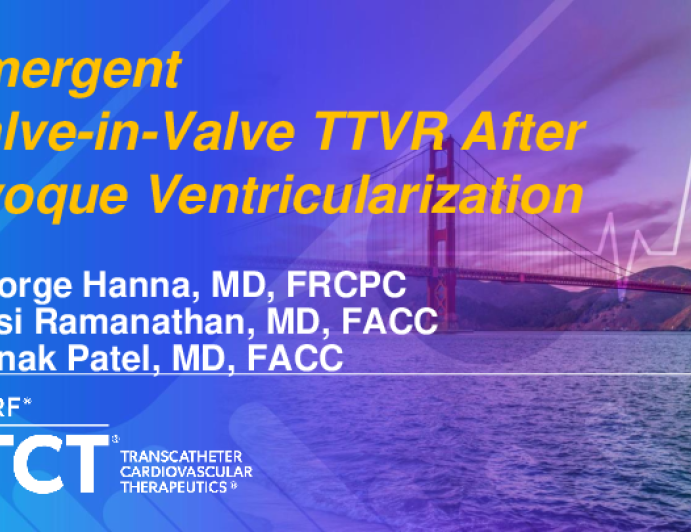 Presentation TCT 2025 TCT 1310: Emergent Tricuspid Valve-in-Valve TTVR After Evoque Ventricularization Presenter: George Hanna October 25, 2025 REGISTER for free or LOG IN to view this content TCT 2025 Up Next Presentation TCT 2025 TCT 1314: Worrisome Fork in the Road: When Double LAMPOON Is Indicated Presenter: Ahmed Ghoneem October 25, 2025 More slides + Presentation TCT 2025 TCT 1316: Mind the Gap: Posterior Mitral Leaflet Cleft Closure Using Transcatheter Edge-to-Edge Repair Presenter: Moody M. Makar October 25, 2025 Presentation TCT 2025 TCT 1317: Preventing Sinus Sequestration in a Failed Evolut With ShortCut: A Dedicated Leaflet Modification Device Presenter: Bassem M. Chehab October 25, 2025 We Recommend Disclosures <p>Nothing to disclose</p>