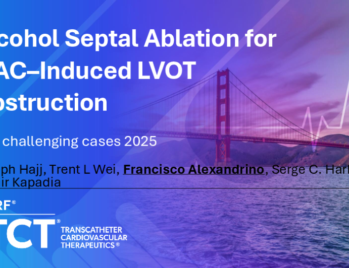 Presentation TCT 2025 TCT 1322: Alcohol Septal Ablation for MAC-Induced LVOT Obstruction Presenter: Francisco Alexandrino October 25, 2025 REGISTER for free or LOG IN to view this content TCT 2025 Up Next Presentation TCT 2025 TCT 1777: Refractory HFrEF Salvaged by Atrial Flow Regulator Presenter: Mega Febrianora October 25, 2025 More slides + Presentation TCT 2025 TCT 1776: A Case of Simultaneous Revascularization for Non-ST Elevation Myocardial Infarction With Multi-Vessel Disease Complicated by Congestive Heart Failure Presenter: Kazuki Ichihara October 25, 2025 Presentation TCT 2025 How Do I Decide on MCS Support in Elective Coronary Intervention? Presenter: Luca Testa October 25, 2025 We Recommend Disclosures <p>Nothing to disclose</p>