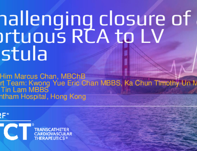 Presentation TCT 2025 TCT 1331: Percutaneous Closure of a Challenging RCA to LV Fistula Presenter: Yat Him Marcus Chan October 27, 2025 REGISTER for free or LOG IN to view this content TCT 2025 Up Next Presentation TCT 2025 Tips and Tricks for Management of Coronary Perforations Presenter: Nicholas Joseph Lembo October 27, 2025 More slides + Presentation TCT 2025 TCT 1328: Acquired Post-Heart Transplantation Dual Coronary-to-Lingular Artery Fistulae: A Rare Case of Systemic-Pulmonary Communication Presenter: Estevao Pardi October 27, 2025 Presentation TCT 2025 Tips and Tricks for Safe and Effective Closureof Coronaro-Structural Fistulas Presenter: Carey D. Kimmelstiel October 27, 2025 We Recommend Disclosures <p>Nothing to disclose</p>