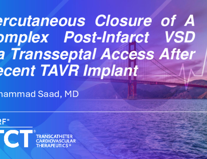 Presentation TCT 2025 TCT 1333: Percutaneous Closure of a Complex Post-Infarct VSD via Transseptal Access After Recent TAVR Presenter: Muhammad Saad October 27, 2025 REGISTER for free or LOG IN to view this content TCT 2025 Up Next Presentation TCT 2025 TCT 1334: Transcatheter Ventricular Septal Defect Closure Supported by Three-Dimensional Modelling Presenter: Adriana Zlahoda-Huzior October 27, 2025 More slides + Presentation TCT 2025 TCT 1335: Novel Transseptal Approach for Percutaneous Closure of Postsurgical Ventricular Septal Defect Presenter: Mikolaj Blaziak October 27, 2025 Presentation TCT 2025 TCT 1336: Acquired Gerbode Defect Following Redo MVR/AVR Presenter: Enhua Wang October 27, 2025 We Recommend Disclosures <p>Nothing to disclose</p>