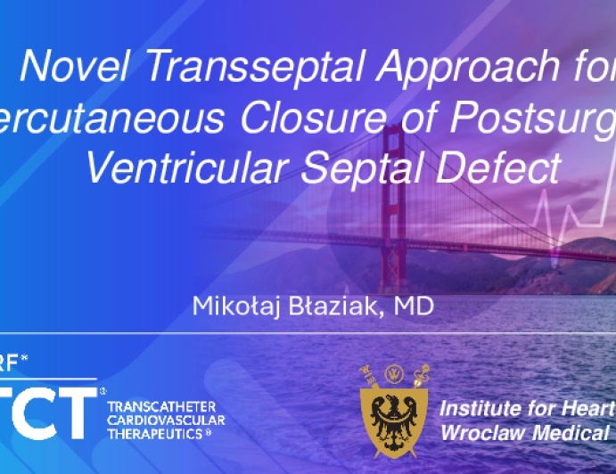 Presentation TCT 2025 TCT 1335: Novel Transseptal Approach for Percutaneous Closure of Postsurgical Ventricular Septal Defect Presenter: Mikolaj Blaziak October 27, 2025 REGISTER for free or LOG IN to view this content TCT 2025 Up Next Presentation TCT 2025 TCT 1336: Acquired Gerbode Defect Following Redo MVR/AVR Presenter: Enhua Wang October 27, 2025 More slides + Presentation TCT 2025 TCT 1337: Percutaneous Transcatheter Occlusion of Acquired Gerbode Defect After TAVR Presenter: Alec Miller October 27, 2025 Presentation TCT 2025 TCT 1446: CLEVE-UNICORN Technique to Prevent Coronary Obstruction After TAVR in Native Valves: A Word of Caution Presenter: Jean-Benoît Veillette October 27, 2025 We Recommend Disclosures <p>Nothing to disclose</p>