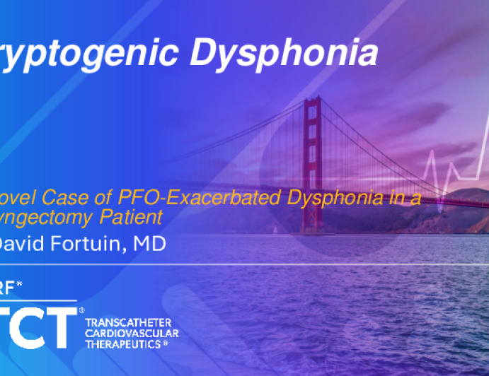 Presentation TCT 2025 TCT 1343: Cryptogenic Dysphonia: A Case of PFO Associated Dysphonia Presenter: F. David Fortuin October 27, 2025 REGISTER for free or LOG IN to view this content TCT 2025 Up Next Presentation TCT 2025 TCT 1406: 3D Simulation Predictive Modeling in Large Annulus Bicuspid Aortic Stenosis With Cardiogenic Shock Presenter: Joseph R. Aragon October 27, 2025 More slides + Presentation TCT 2025 TCT 1445: Leaflet Modification Using UNICORN Technique Before Vave-in-Valve-in-Valve TAVR Presenter: Chirag Bavishi October 27, 2025 Presentation TCT 2025 TCT 1444: Valve-in-Valve-in-Valve TAVR With Bilateral UNICORN Modification: A High-Risk Solution for Coronary Obstruction Prevention in Severe Aortic Insufficiency Presenter: Billal Ahmed Mohmand October 27, 2025 We Recommend Disclosures <p>Nothing to disclose</p>