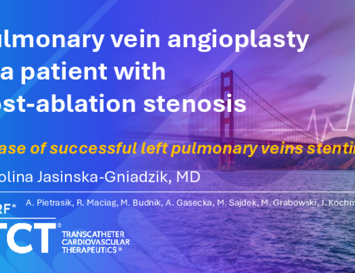 Presentation TCT 2025 TCT 1352: Pulmonary Vein Angioplasty in a Patient With Post-Ablation Stenosis Presenter: Karolina Jasinska-Gniadzik October 25, 2025 REGISTER for free or LOG IN to view this content TCT 2025 Up Next Presentation TCT 2025 TCT 1555: Handmade Covered Stent: For Type III Coronary Artery Perforation Presenter: Kesavamoorthy Bhoopalan October 26, 2025 More slides + Presentation TCT 2025 TCT 1712: Percutaneous Retrieval of the Undeflatable Balloon That Was Entrapped and Broken in Coronary Artery: How Did I Deal With It? Presenter: Sriram Tiwari October 25, 2025 Presentation TCT 2025 TCT 1479: A Complicated Re-do Mitral Valve Paravalvular Leak Closure Presenter: Manolis Vavuranakis October 25, 2025 We Recommend Disclosures <p>Nothing to disclose</p>