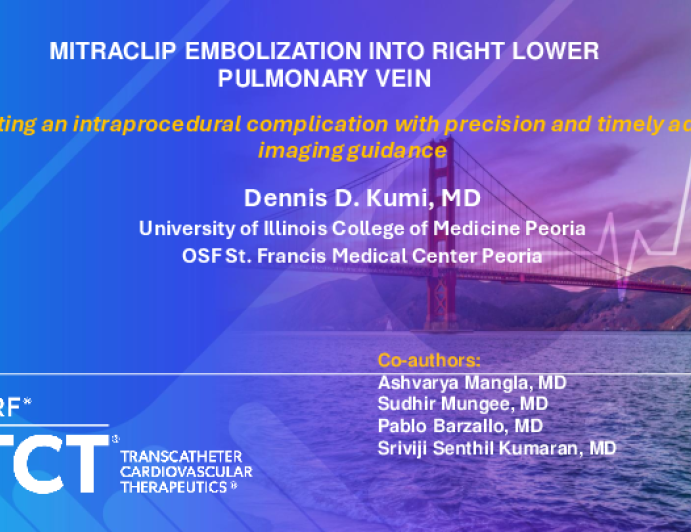 Presentation TCT 2025 TCT 1355: MitraClip Embolization Into Right Lower Pulmonary Vein Presenter: Dennis Danso Kumi October 25, 2025 REGISTER for free or LOG IN to view this content TCT 2025 Up Next Presentation TCT 2025 TCT 1354: Removal of an Embolized Leadless Pacemaker From the Pulmonary Artery Using a Novel Snare-to-Retrieval Catheter Daisy Chain Approach Presenter: Jake Read October 25, 2025 More slides + Presentation TCT 2025 TCT 1353: Percutaneous Retrieval of Embolized Avier Leadless Atrial Pacemaker From the Left Pulmonary Artery Using a Novel Retrieval System Presenter: Yashasvi Chugh October 25, 2025 Presentation TCT 2025 TCT 1352: Pulmonary Vein Angioplasty in a Patient With Post-Ablation Stenosis Presenter: Karolina Jasinska-Gniadzik October 25, 2025 We Recommend Disclosures <p>Nothing to disclose</p>