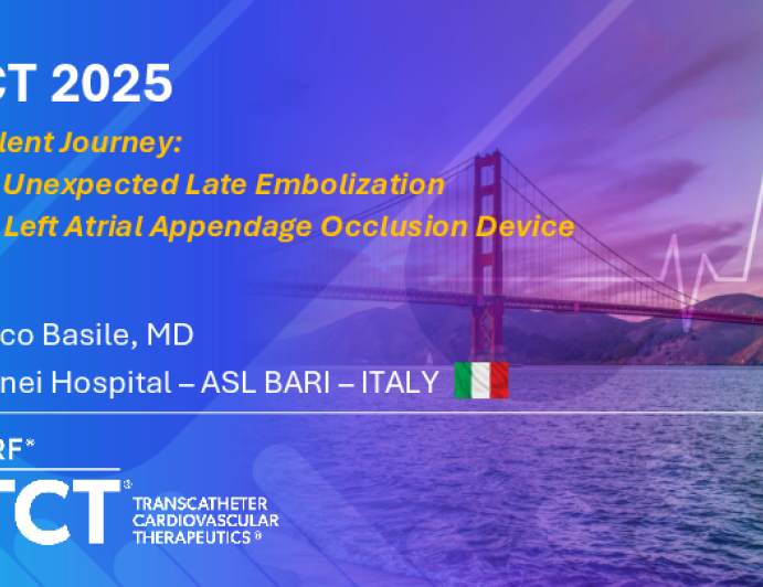 Presentation TCT 2025 TCT 1365: A Silent Journey: The Unexpected Late Embolization of a Left Atrial Appendage Occlusion Device Presenter: Marco Basile October 26, 2025 REGISTER for free or LOG IN to view this content TCT 2025 Up Next Presentation TCT 2025 TCT 1905: Endovascular Repair of Juxtarenal Thoracoabdominal Aortic Aneurysm Using a Thoracoabdominal Branch Endoprosthesis (TAMBE): Interventional Cardiology and Vascular Insights Presenter: Chaitanya Tumuluri October 26, 2025 More slides + Presentation TCT 2025 TCT 1937: Right on Target: Catheter-Associated RA Thrombus Removed via Penumbra Aspiration Presenter: Nina Shyama Appareddy October 26, 2025 Presentation TCT 2025 How Do I Derisk TAVR in Challenging or Previously Treated Aortic Anatomy Presenter: Oscar A. Mendiz October 26, 2025 We Recommend Disclosures <p>Nothing to disclose</p>