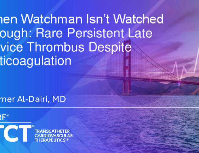 Presentation TCT 2025 TCT 1369: When Watchman Isn’t Watched Enough: Rare Persistent Late Device Thrombus Despite Anticoagulation Presenter: Ammer Aldairi October 25, 2025 REGISTER for free or LOG IN to view this content TCT 2025 Up Next Presentation TCT 2025 TCT 1368: Percutaneous Aspiration Thrombectomy of Left Atrial Thrombus During Left Atrial Appendage Occlusion With Watchman Device Presenter: Jevin Yabut October 25, 2025 More slides + Presentation TCT 2025 TCT 1780: LAVA ECMO Assisted Complex PCI in a High Risk Patient With LV Thrombus and Multivessel Disease: A Case of Successful Revascularization Presenter: Anya de Leeuw October 25, 2025 Presentation TCT 2025 TCT 1778: Real-Time IVUS-Guided Minimal CRUSH for Bifurcation Stenting: IM-CRUSH Presenter: Cheuk Bong Ho October 25, 2025 We Recommend Disclosures <p>Nothing to disclose</p>