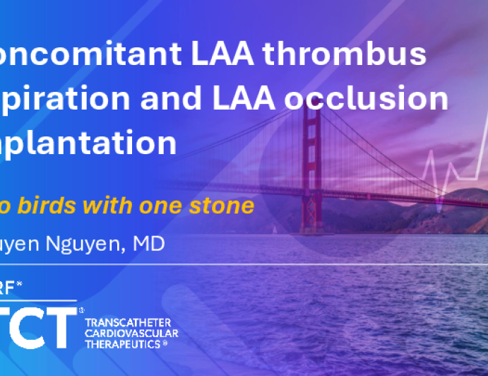 Presentation TCT 2025 TCT 1370: Concomitant Mechanical Aspiration and Appendage Closure: Two Birds With One Stone Presenter: Nguyen Nguyen October 25, 2025 REGISTER for free or LOG IN to view this content TCT 2025 Up Next Presentation TCT 2025 TCT 1369: When Watchman Isn’t Watched Enough: Rare Persistent Late Device Thrombus Despite Anticoagulation Presenter: Ammer Aldairi October 25, 2025 More slides + Presentation TCT 2025 TCT 1368: Percutaneous Aspiration Thrombectomy of Left Atrial Thrombus During Left Atrial Appendage Occlusion With Watchman Device Presenter: Jevin Yabut October 25, 2025 Presentation TCT 2025 TCT 1780: LAVA ECMO Assisted Complex PCI in a High Risk Patient With LV Thrombus and Multivessel Disease: A Case of Successful Revascularization Presenter: Anya de Leeuw October 25, 2025 We Recommend Disclosures <p>Nothing to disclose</p>