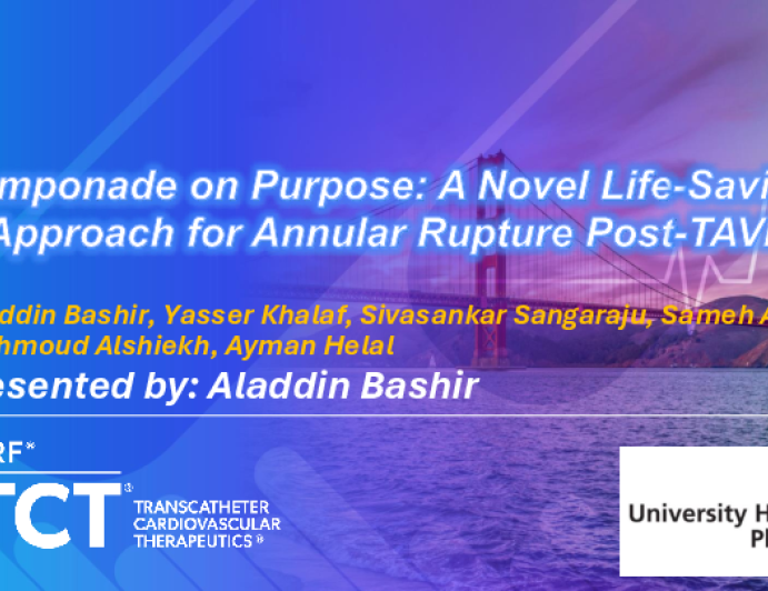 Presentation TCT 2025 TCT 1388: Tamponade on Purpose: A Novel Life-Saving Approach for Annular Rupture Post-TAVI Presenter: Aladdin Bashir October 27, 2025 REGISTER for free or LOG IN to view this content TCT 2025 Up Next Presentation TCT 2025 TCT 1387: Unexpected Cardiac Tamponade Post Transcather Aortic Valve Implantation Diagnostic and Therapeutic Challenges Presenter: Rocio Fernandez Montalvetti October 27, 2025 More slides + Presentation TCT 2025 My Tips and Tricks for Prevention and Management of Aortic Perforations Presenter: Luigi Salemme October 27, 2025 Presentation TCT 2025 TCT 1916: Successful Percutaneous Transluminal Renal Angioplasty for Atherosclerotic Bilateral Renal Artery Stenosis in a Super-Elderly Patient With Refractory Hypertension, Acute Heart Failure, and Renal Failure Presenter: Kota Komiyama October 27, 2025 We Recommend Disclosures <p>Nothing to disclose</p>