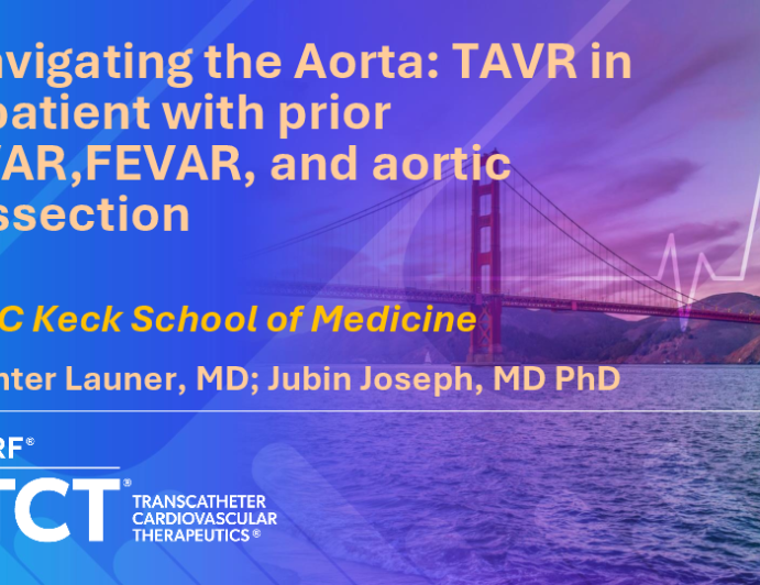 Presentation TCT 2025 TCT 1415: Navigating the Aorta: TAVR in a Patient With Prior EVAR, FEVAR, and Aortic Dissection Presenter: Hunter Edward Launer October 26, 2025 REGISTER for free or LOG IN to view this content TCT 2025 Up Next Presentation TCT 2025 TCT 1416: TAVI Through the Curve: Managing Graft Kinking and Arch Tortuosity Presenter: Mi Chen October 26, 2025 More slides + Presentation TCT 2025 Tips and Tricks for Avoiding Complications of Endovascular Treatment of Aortic Disease Presenter: Robert Earl Beasley October 26, 2025 Presentation TCT 2025 TCT 1902: Custom-Made Fenestrated Endovascular Repair for Thoracoabdominal Aneurysm, Preserving Renal and Superior Mesenteric Arteries Presenter: Hong Ki Jeon October 26, 2025 We Recommend Disclosures <p>Nothing to disclose</p>