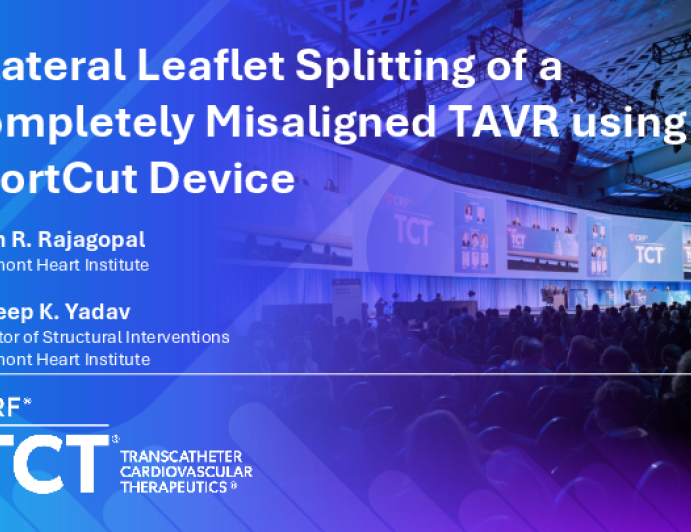 Presentation TCT 2025 TCT 1442: Bilateral Leaflet Splitting of a Completely Misaligned TAVR Using the ShortCut Device Presenter: Jadon Ray Rajagopal October 27, 2025 REGISTER for free or LOG IN to view this content TCT 2025 Up Next Presentation TCT 2025 My Tips and Tricks for Aortic Leaflet Modification Presenter: John Thomas Saxon October 27, 2025 More slides + Presentation TCT 2025 My Tips and Tricks for Prevention and Management of CTO Dissections Presenter: Francis Joshi October 27, 2025 Presentation TCT 2025 How Do I Prepare for TAV-in-SAV? Presenter: Christian Frerker October 27, 2025 We Recommend Disclosures <p>Nothing to disclose</p>
