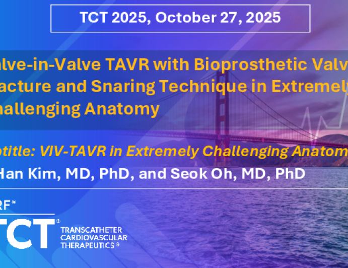 Presentation TCT 2025 TCT 1449: VIV-TAVR With Navitor for Small Annulus and Severely Angulated Aorta: Snaring and BVF Approach Presenter: Ju Han Kim October 27, 2025 REGISTER for free or LOG IN to view this content TCT 2025 Up Next Presentation TCT 2025 TCT 1405: Accurate Positioning of Balloon-Expandable Valve for Aortic Stenosis With Huge Left Ventricular Outflow Tract Calcification Presenter: Aoi Omori October 27, 2025 More slides + Presentation TCT 2025 TCT 1436: Moderate Intraprosthetic Aortic Insufficiency Immediately After Implantation That Self-Resolved on One-Month Follow-Up Echocardiogram Presenter: Marlena Lesniowska October 27, 2025 Presentation TCT 2025 My Tips and Tricks for Prevention and Management of mTEER Complications Presenter: Jacob M. Mishell October 27, 2025 We Recommend Disclosures <p>Nothing to disclose</p>