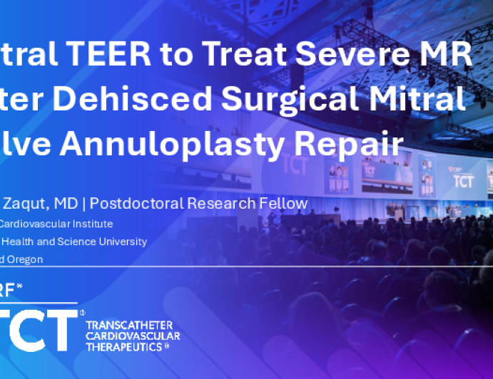 Presentation TCT 2025 TCT 1473: Mitral TEER to Treat Severe MR After Dehisced Surgical Mitral Valve Annuloplasty Repair Presenter: Anas Ibrahim Zaqut October 27, 2025 REGISTER for free or LOG IN to view this content TCT 2025 Up Next Presentation TCT 2025 Lessons Learned From My Most Memorable Urgent Coronary Cases Complicated by Aortic Stenosis (or the Other Way Around) Presenter: Corrado Tamburino October 27, 2025 More slides + Presentation TCT 2025 TCT 1786: A 57-Year-Old Presenting With Cardiogenic Shock, Severe Ischemic Cardiomyopathy and Critical Aortic Valve Stenosis Presenter: Adnan Alexander Kassier October 27, 2025 Presentation TCT 2025 TCT 1787: BAV as a Bridge to Impella-Protected Indicated High-Risk PCI in a Patient With Severe Aortic Stenosis and Calcified MVD Presenter: Jan Roczniak October 27, 2025 We Recommend Disclosures <p>Nothing to disclose</p>