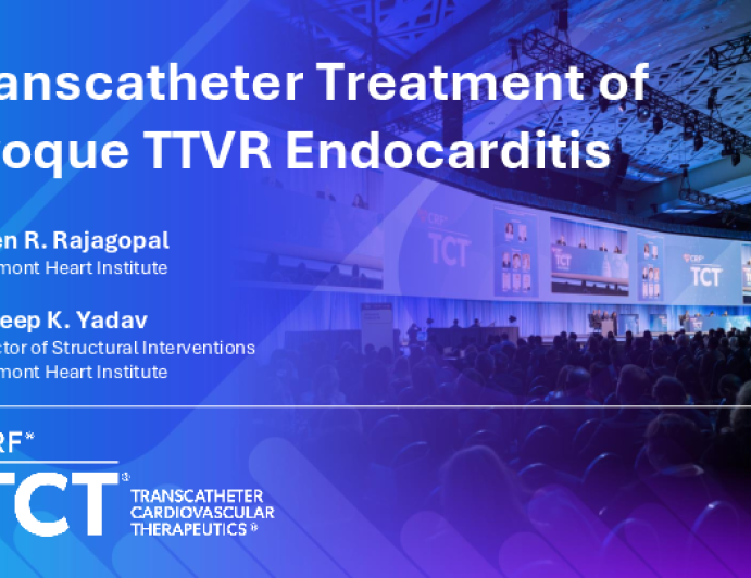 Presentation TCT 2025 TCT 1513: Transcatheter Treatment of Evoque TTVR Endocarditis Presenter: Deven Ray Rajagopal October 25, 2025 REGISTER for free or LOG IN to view this content TCT 2025 Up Next Presentation TCT 2025 TCT 1681: ST Elevations and Coronary Ectasia: A Cardiac Metastasis Mimicking MI Presenter: Matthew King October 25, 2025 More slides + Presentation TCT 2025 TCT 1683: Subacute Anterior STEMI as an Initial Presentation of Large Left Atrial Myxoma: A Rare Case Report Presenter: Chanokporn Puchongmart October 25, 2025 Presentation TCT 2025 TCT 1684: Myocardial Infarction in a Young Woman With Multiple Coronary Aneurysms: Therapeutic Challenge Presenter: Seojin Hur October 25, 2025 We Recommend Disclosures <p>Nothing to disclose</p>
