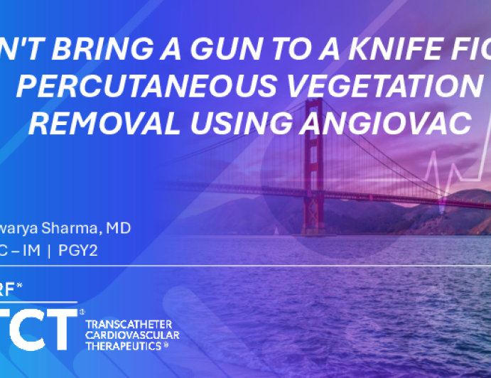 Presentation TCT 2025 TCT 1516: Don't Bring a Gun to a Knife Fight: Percutaneous Vegetation Removal Using AngioVac Presenter: Aishwarya Sharma October 25, 2025 REGISTER for free or LOG IN to view this content TCT 2025 Up Next Presentation TCT 2025 TCT 1430: Valve-in-Valve TAVR With Preceding Paravalvular Leak Closure for a Failed Bioprosthesis Presenter: Changxi Chen October 25, 2025 More slides + Presentation TCT 2025 TCT 1429: Managing Complex Post TAVR PVL: Redo Short in Short and Plug Strategy Presenter: Sahil Khera October 25, 2025 Presentation TCT 2025 TCT 1428: Transcatheter Closure of Two Separate Paravalvular Leaks Guided by Multimodality Imaging Presenter: Amr Mohsen October 25, 2025 We Recommend Disclosures <p>Nothing to disclose</p>