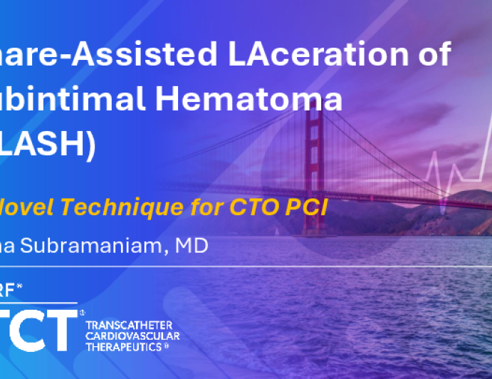Presentation TCT 2025 TCT 1539: Snare-Assisted LAceration of Subintimal Hematoma (SLASH): A Novel Technique for CTO PCI Presenter: Anna Subramaniam October 25, 2025 REGISTER for free or LOG IN to view this content TCT 2025 Up Next Presentation TCT 2025 TCT 1551: A Case Report on the Use of Rotational Atherectomy and Shockwave IVL to Treat Left Main Stent Under-Expansion Presenter: Zhiyong Zhang October 25, 2025 More slides + Presentation TCT 2025 TCT 1550: Undeflatable Balloon in Left Main Triggering a Cascade of Catastrophic Events Presenter: Sunanto Ng October 25, 2025 Presentation TCT 2025 TCT 1549: Use of Envast Stent Retriever for Thrombus Extraction in STEMI With High Thrombus Burden and Coronary Ectasia of the Right Coronary Artery Presenter: Carlos Eduardo Vergara Uzcategui October 25, 2025 We Recommend Disclosures <p>Nothing to disclose</p>