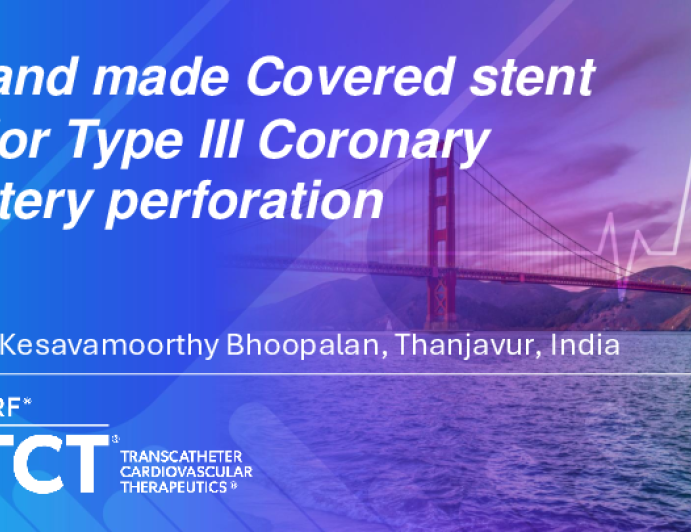 Presentation TCT 2025 TCT 1555: Handmade Covered Stent: For Type III Coronary Artery Perforation Presenter: Kesavamoorthy Bhoopalan October 26, 2025 REGISTER for free or LOG IN to view this content TCT 2025 Up Next Presentation TCT 2025 TCT 1712: Percutaneous Retrieval of the Undeflatable Balloon That Was Entrapped and Broken in Coronary Artery: How Did I Deal With It? Presenter: Sriram Tiwari October 25, 2025 More slides + Presentation TCT 2025 TCT 1479: A Complicated Re-do Mitral Valve Paravalvular Leak Closure Presenter: Manolis Vavuranakis October 25, 2025 Presentation TCT 2025 TCT 1395: Hostile Aortic Valve Calcification: To TAVR or Not to TAVR? Presenter: Konstantinos Stathogiannis October 25, 2025 We Recommend Disclosures <p>Nothing to disclose</p>