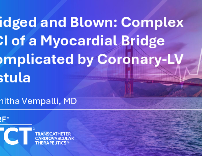 Presentation TCT 2025 TCT 1559: Bridged and Blown: Complex PCI of a Myocardial Bridge Complicated by Coronary-LV Fistula Presenter: Nishitha Reddy Vempalli October 28, 2025 REGISTER for free or LOG IN to view this content TCT 2025 Up Next Presentation TCT 2025 TCT 1385: The Use of Prophylactic VA-ECMO With High-Risk TAVR Presenter: Nicholas Wenz October 28, 2025 More slides + Presentation TCT 2025 TCT 1386: A Triple TAVR Trouble: When Bleeding Infection and Valve Disease Collide Presenter: Eloina Baltazar October 28, 2025 Presentation TCT 2025 My Tips and Tricks for Prevention and Management of Perforations Presenter: Jarrod Frizzell October 28, 2025 We Recommend Disclosures <p>Nothing to disclose</p>